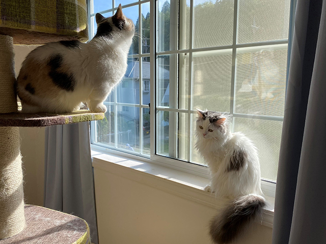 完全室内飼養ですが、窓を開けると木々のざわめきや鳥のさえずりが聴こえて、猫ちゃんたちの想像力を掻き立てているようです。